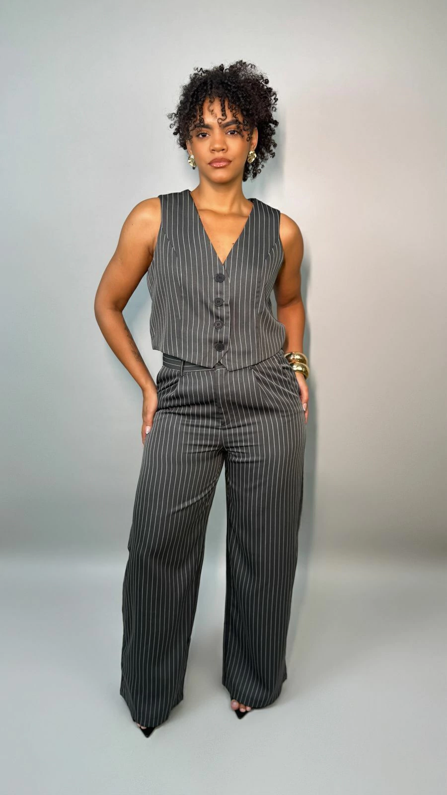 O Conjunto Sheila é a definição de elegância moderna.,composto por colete e calça de alfaiataria em risca de giz, esse conjunto traz um ar sofisticado e contemporâneo ao visual, sem abrir mão do conforto. O colete possui modelagem acinturada, decote em V e fechamento frontal por botões, conferindo um toque refinado. Já a calça tem caimento reto e cintura média com passantes, garantindo uma silhueta alongada e poderosa.